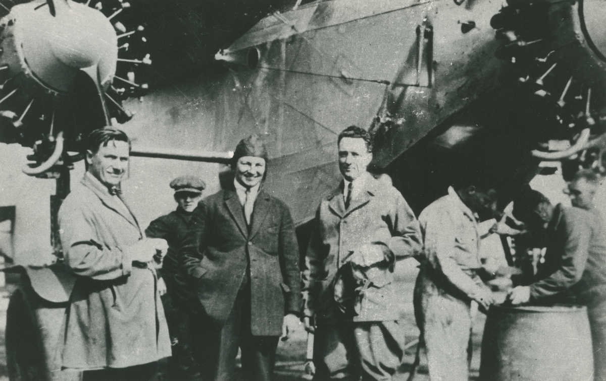 Fotografi från låda märkt Bernt Balchen. Balchen var norsk-amerikansk flygare, polarforskare och militär. Motiv av flera män som står framför flygplan.