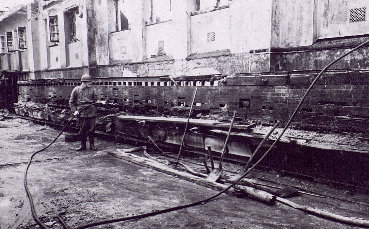 Branden i Västerås telefonstation den 22 sept. 1942. Röjningsarbete i telefonsalen.