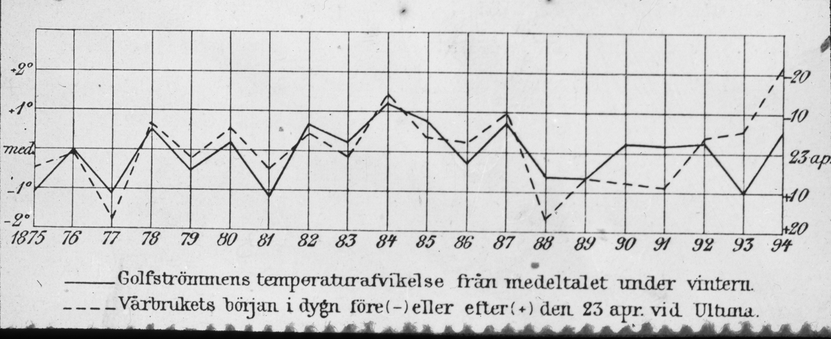 Skioptikonbild med rörande torvberedning. Diagram över Golfströmmens temperaturafvikelser från medeltalet under vintern.