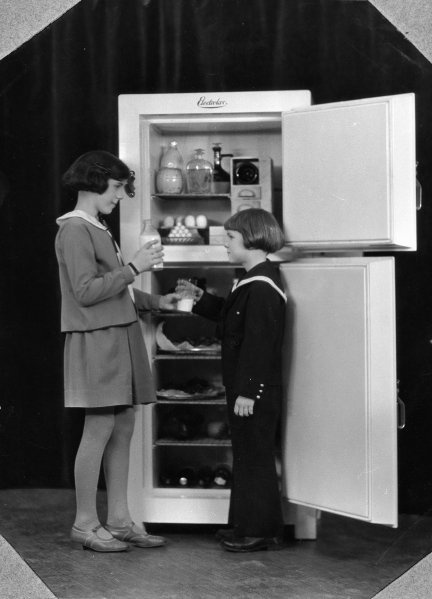 2 kylskåp i ett hölje, öppet. Pojke och flicka som demonstratörer.