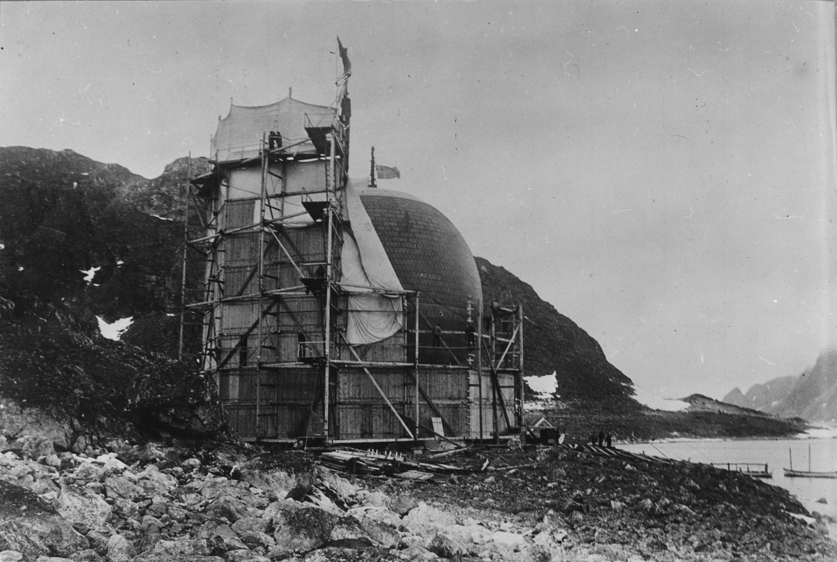 Ballonghuset till S.A. Andrées ballong under uppförande på Spetsbergen.