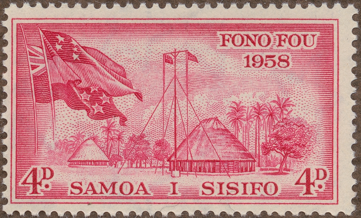 Frimärke från Samoa, 1958. Motiv av Samoa:s och New Zealand:s flaggor i Samoa samhälle -Minne av Samoas första regeringssamling. 1958-