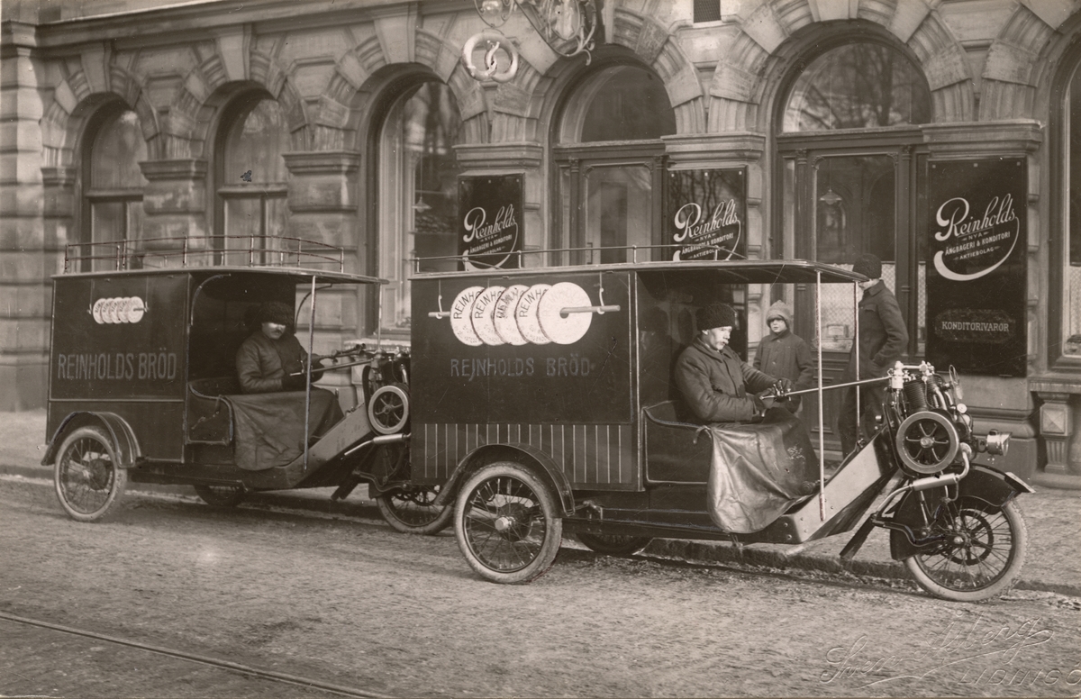 Phänomobiler i Reinholds Ångbageri & konditoris tjänst med firmareklam för "Rejnholds Bröd". Adress Sveavägen 54-58, "Reinholdska huset".