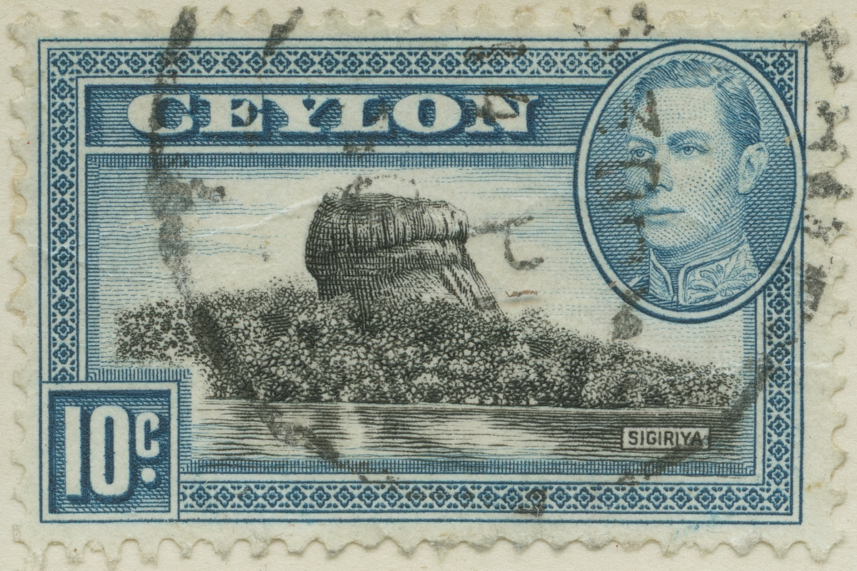 Frimärke ur Gösta Bodmans filatelistiska motivsamling, påbörjad 1950. Frimärke från Ceylon Indien, 1937. Motiv av Berget Sigiriya "-Lejontoppen-" Kung George VI.