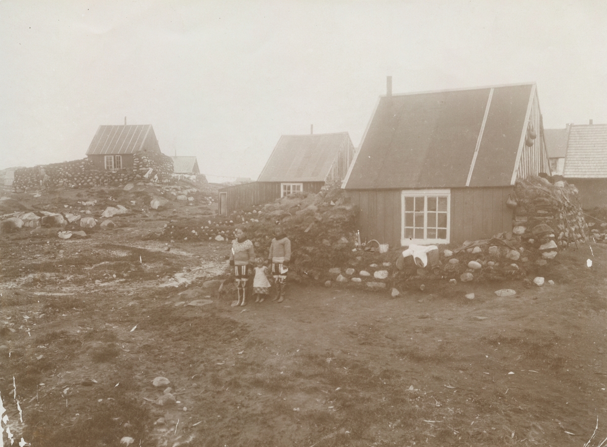 Fotografi från expedition till Grönland. Motiv av tre flickor som står uppställda framför ett litet trähus. På bilden syns fem hus.