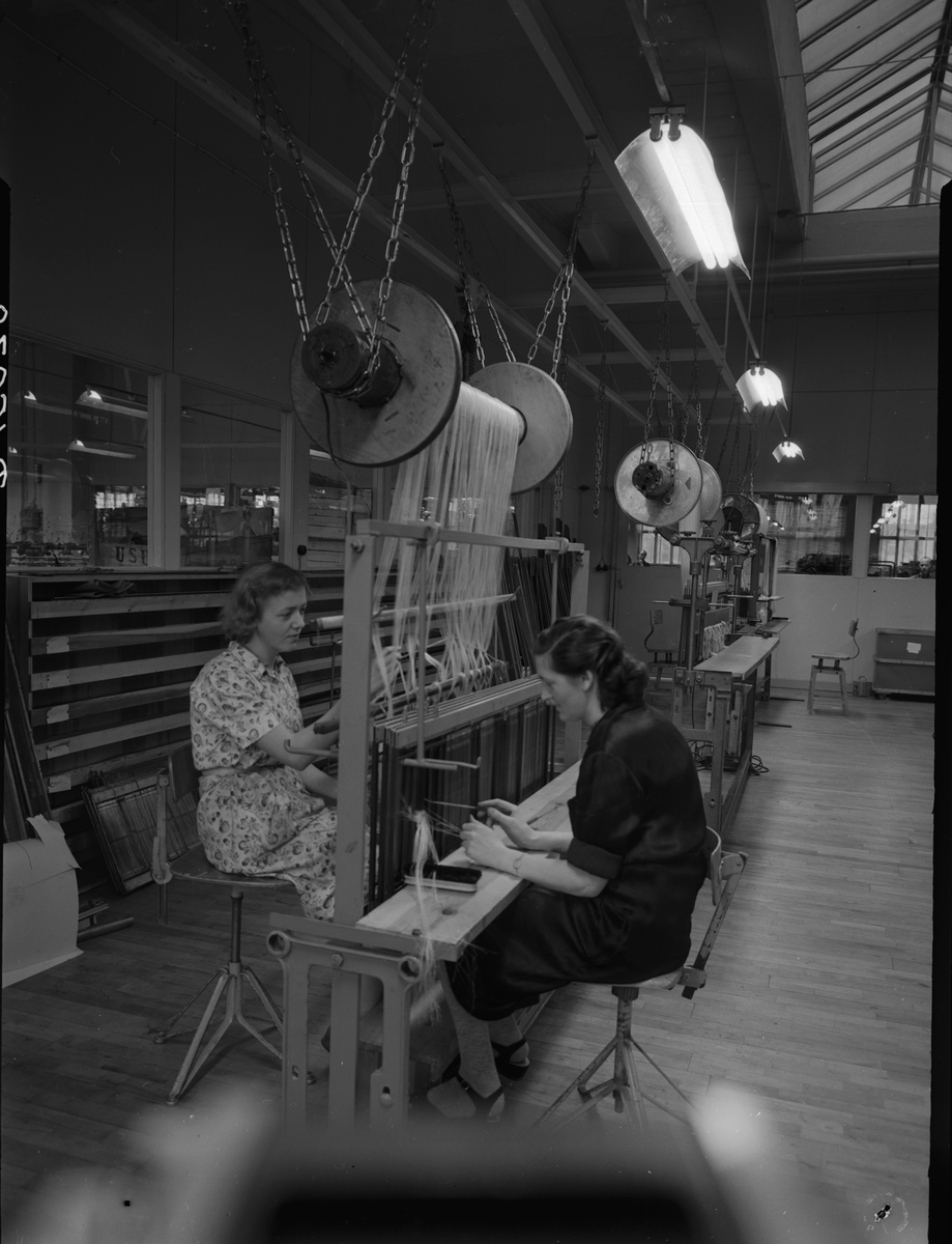 Lysrör i textilfabrik. Kvinnor vid vävstolar.