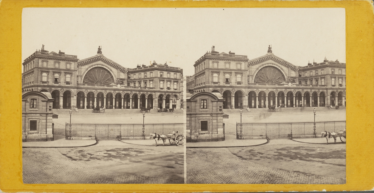 Stereobild med motiv av Gare de l'Est (Östra station) i Paris. Tågstation för passagerartrafik. Öppnade 1849.