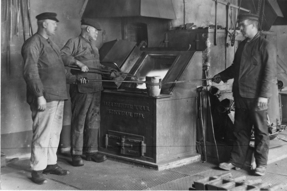 Mynttillverkning, okänd fabrik. Guldet är nedsmält och färdigt att uthällas.