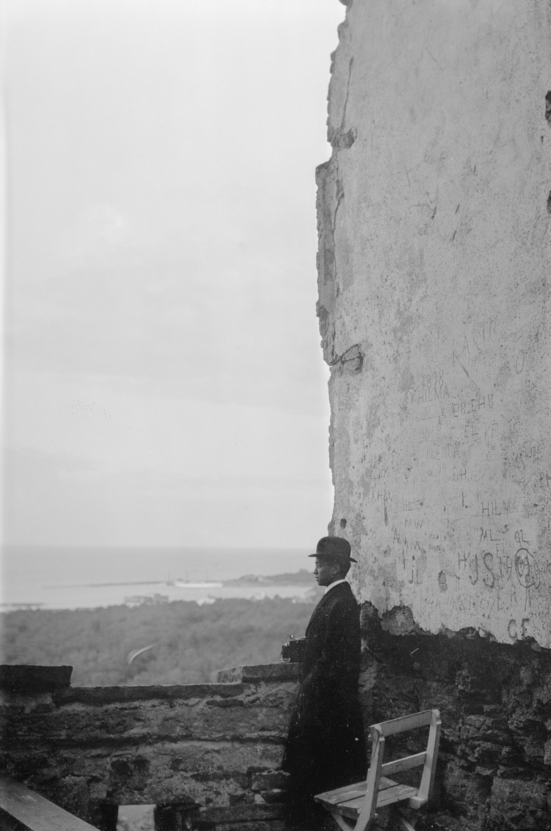 Drottning Victorias bilder. En man med kamera i handen stående vid ett högt berg, tittande ut över havet, vid Borgholms slottsruin