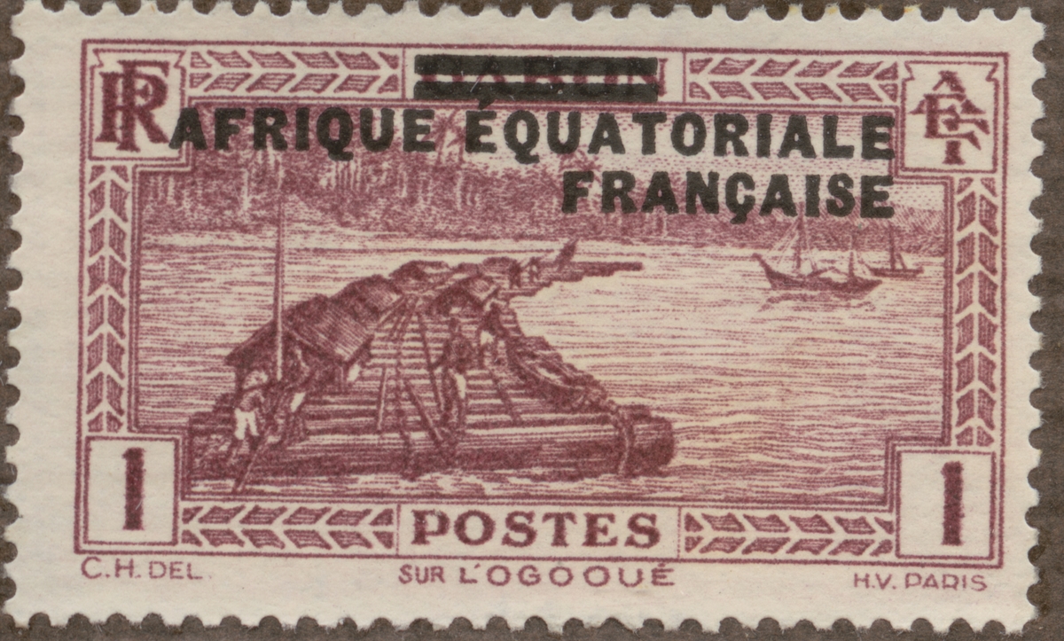Frimärke från Franska Ekvatorialafrika, 1936. Motiv av virkestransport vid floden L'Ogooué, Franska Kongo,