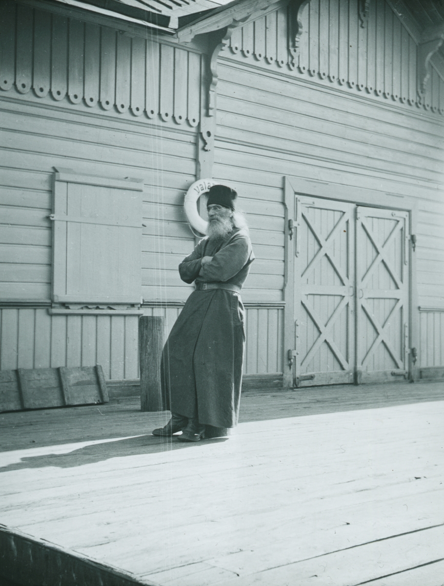 Glasnegativ med motiv av man med mössa, skägg iklädd kaftanliknande ytterplagg.