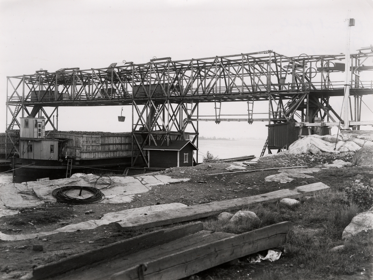 Transportbrygga för lastning av träkol eller grus. Okänd plats. Omkring 1910.