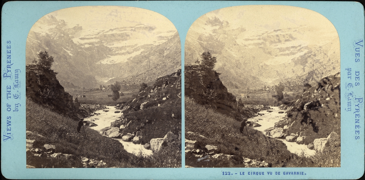 Stereobild av Cirque de Gavarnie, Pyrenéerna, man vid bäcken.