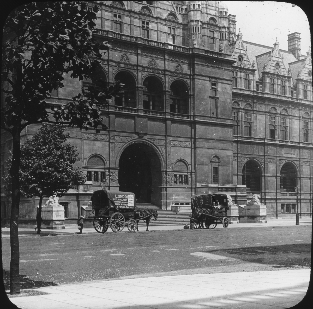 Skioptikonbild med motiv från Sigurd Curmans resor i Europa. Okänd byggnad, London.