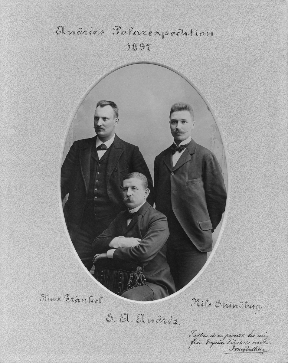 Porträtt av S.A. Andrée s Polarexpeditions medlemmar. Knut Fraenkel, S.A. Andrée och Nils Strindberg. Porträttet var en present till Ivar Svedberg från Fraenkels mor.