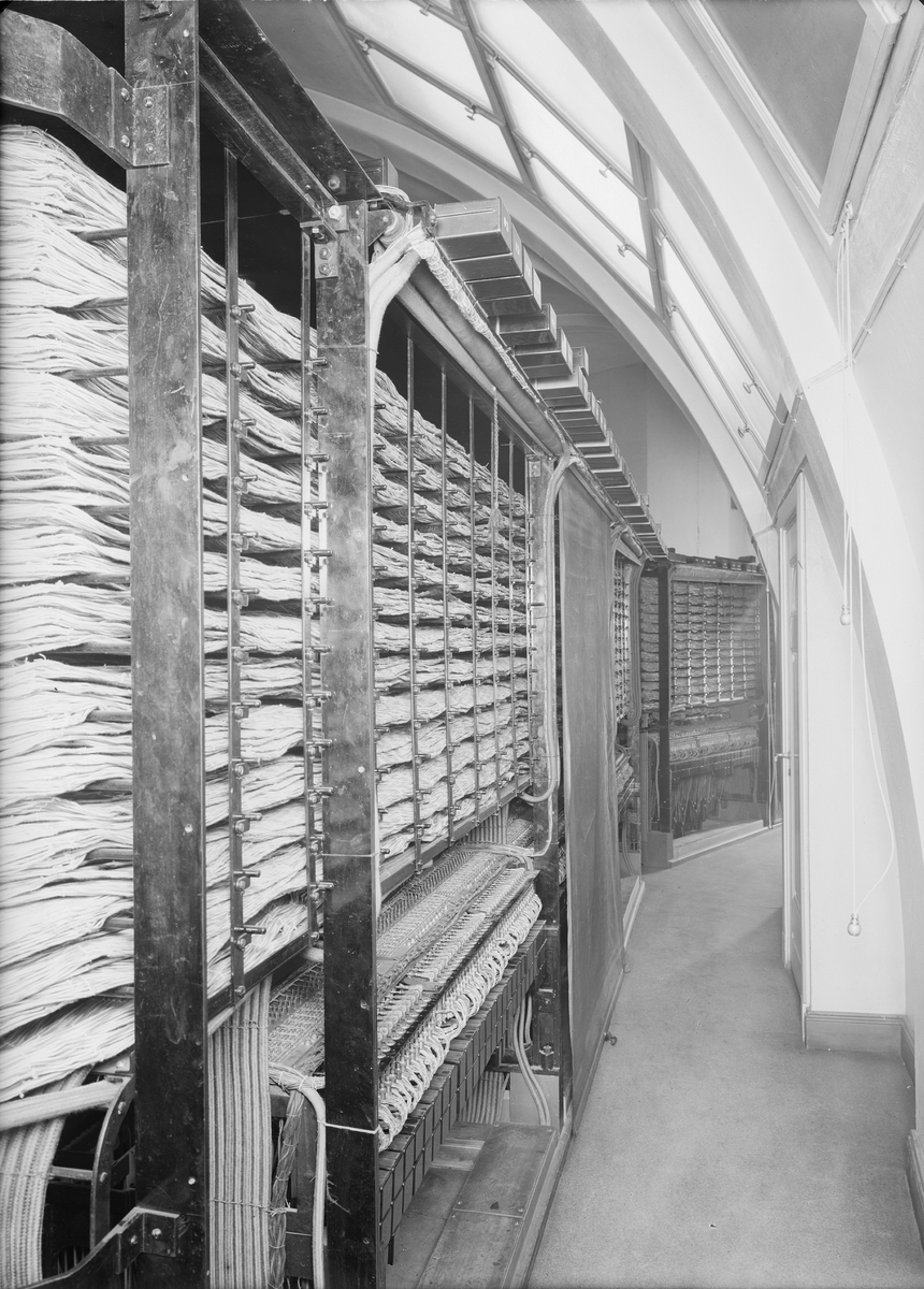 Östermalms rikstelefonstation Karlaplan 2, Stockholm. Baksidan av växelborden. Övre salen.