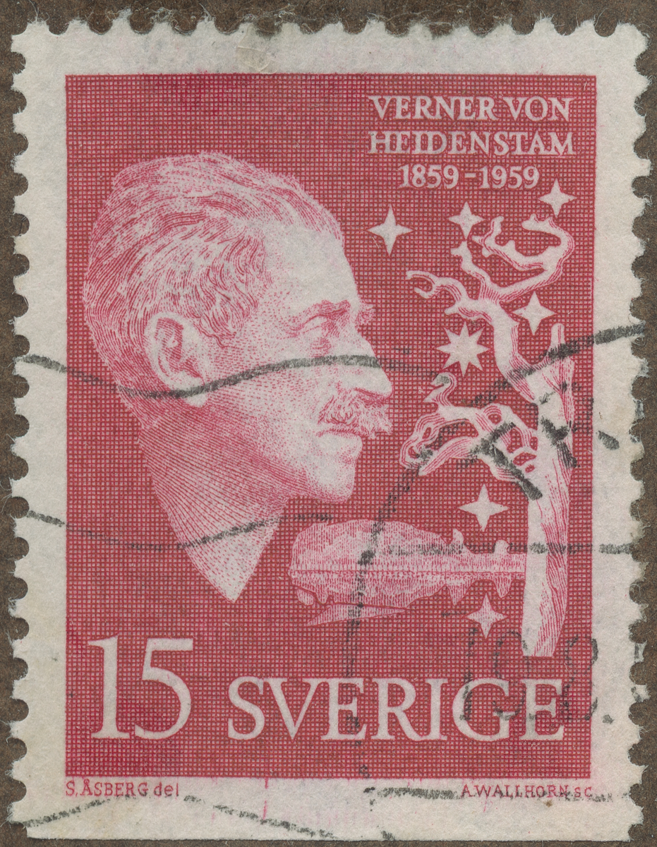 Frimärke från Sverige, 1959. Motiv av Verner von Heidenstam 1859-1940 Författare Skald Nobelpriset 1916 -100-årsminne av diktarens födelse: 1859-1959-