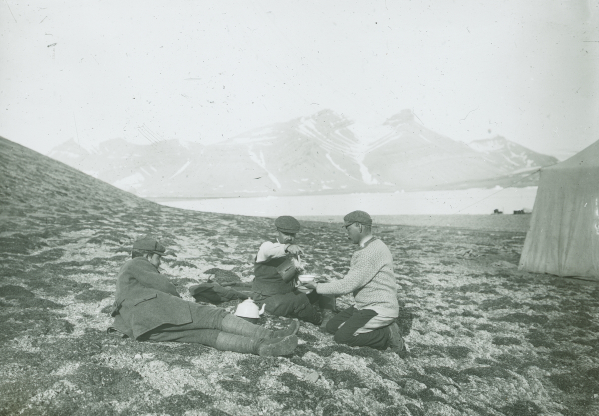 Fotografi från expedition till Spetsbergen. Motiv av tre män som dricker kaffe i bergslandskap.