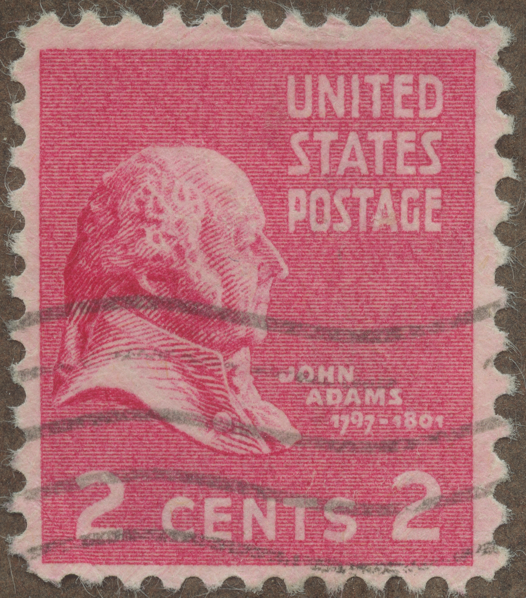 Frimärke från U.S.A., 1938. Motiv av Byst av John Adams: 1735-1826. i Washington Kapitoliet. Jurist. USA:s 2:ndra president: 1797-1800. Av Daniel Chester French.
