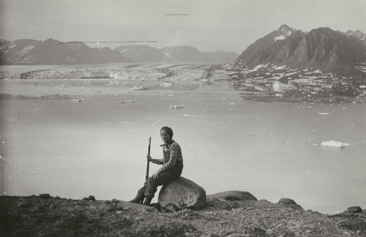Diverse bilder ur Fred Goldbergs samling. Motiv av Thea Ahlberg som sitter på sten vid ett istäckt bergslandskap.
