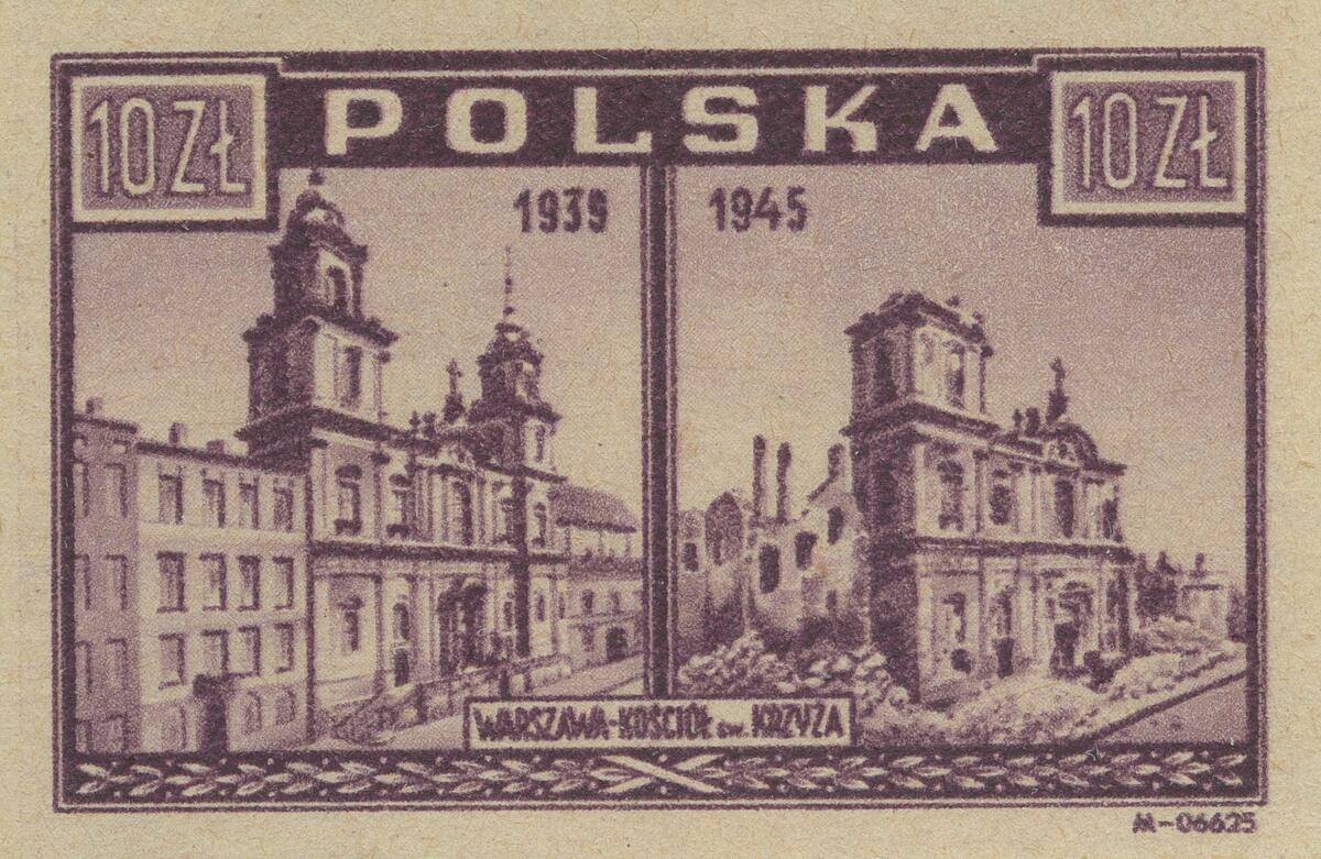 Frimärke från Polen, 1945. Motiv av Warschau Före och efter bombning 1939 och 1945
