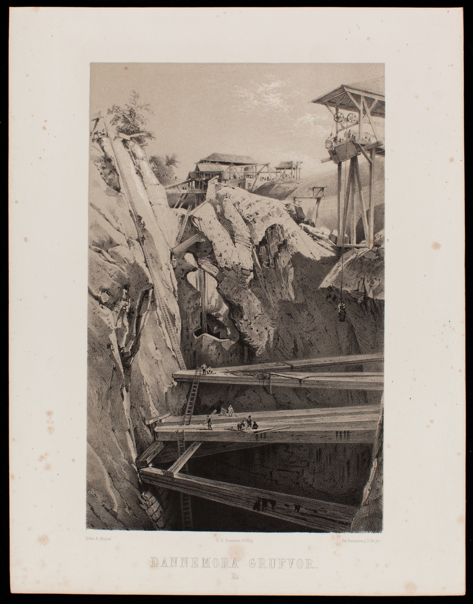 Litografi. Tyckt bild med motiv av Dannemora gruva.