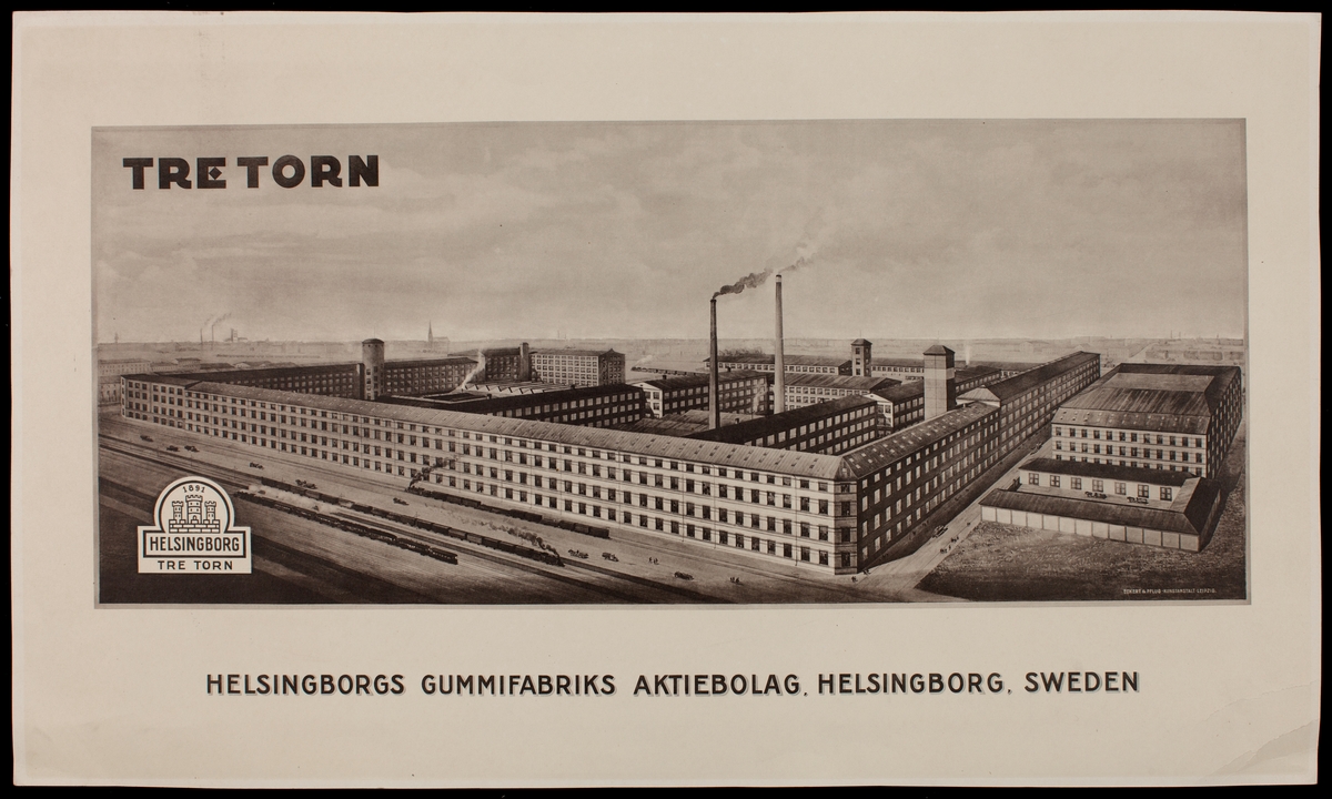 Plansch med motiv av Helsingborgs Gummifabriks AB. Tre Trorn.