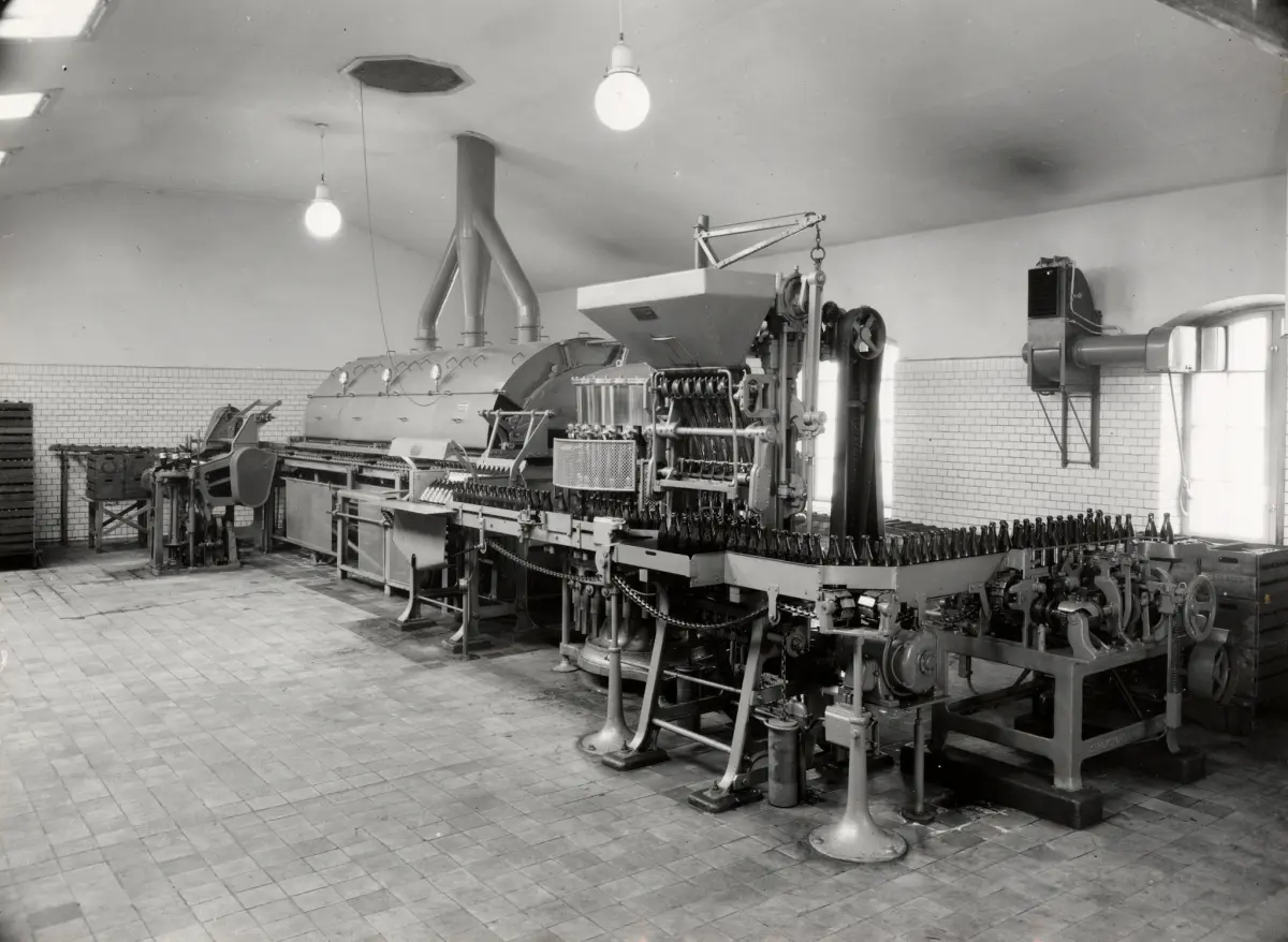 Nyköping Bryggeri Aktiebolag. Interiör av skölj- och tappningsanläggningen. Skölj- tapp- och korkmaskiner av AB Bryggerimaskiners i Malmö fabrikat. Etikettmaskin från Strömsfors bruk.