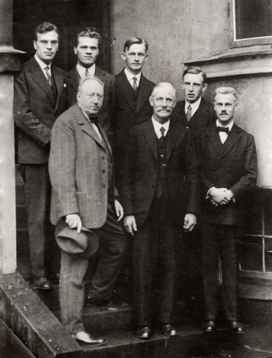 Herrsällskap på trappa. Längst ned till vänster i bilden står John Hertzberg. I övrigt på bilden finns herrarna: Borelius (1889-1985, längst ned till höger, professor i fysik KTH), Rosenhall, Tullström, Gummesson, Lindhe och Johnsson. (För mer info: se ytterligare text på bildens baksida)