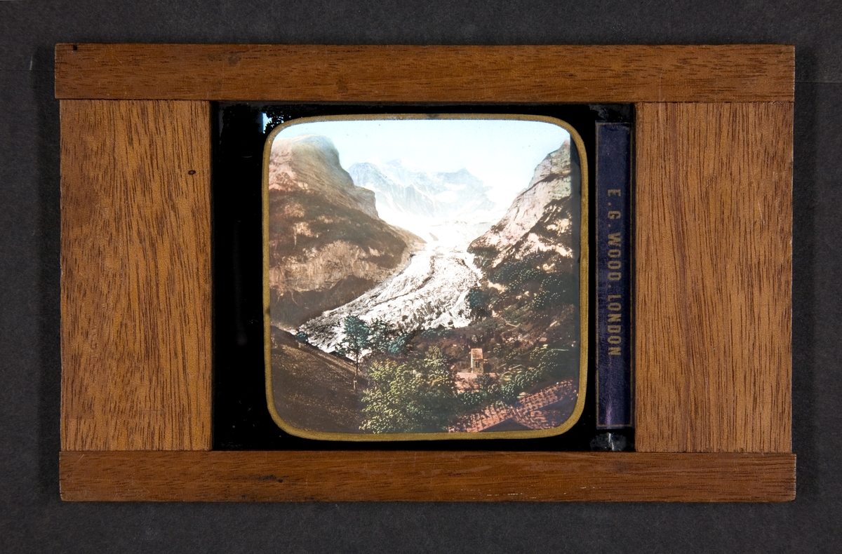 Colorerat fotografi på glas för skioptikon/laterna magica.