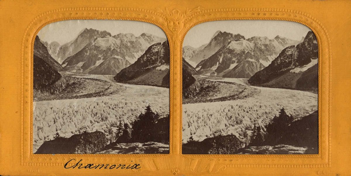 Stereobild av man sittande på berg, blickande ut över glaciären i Chamonix.