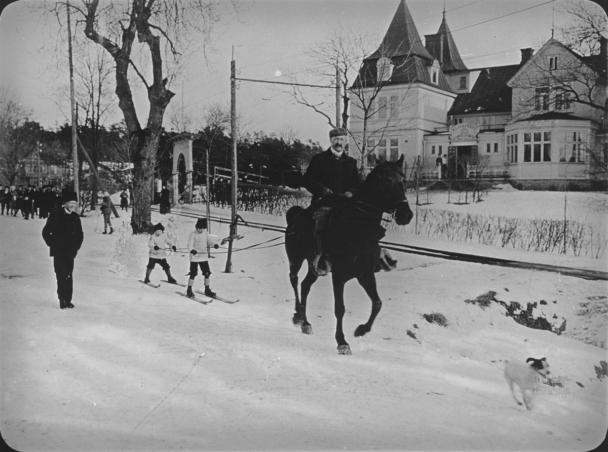 Projektionsbild. Vintersport. Sidåkning efter häst.