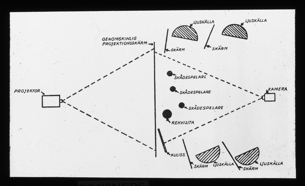 Schematisk framställning av förfarandet vid bakprojektion. Observera att strålkastarna för scenens belysning inte får kasta ljus på den halvgenomskinliga bakrpojektionsduken, vilken är belyst genom den bild som projicieras från projektorn.
