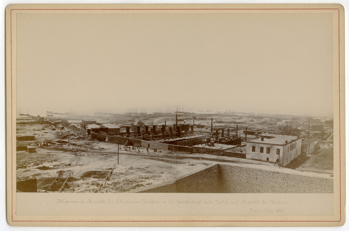Allmän vy över Bröderna Nobels oljeraffinaderi med utsikt mot hamnen. Baku juli 1883. (Mer text finns på baksidan av fotografiet).