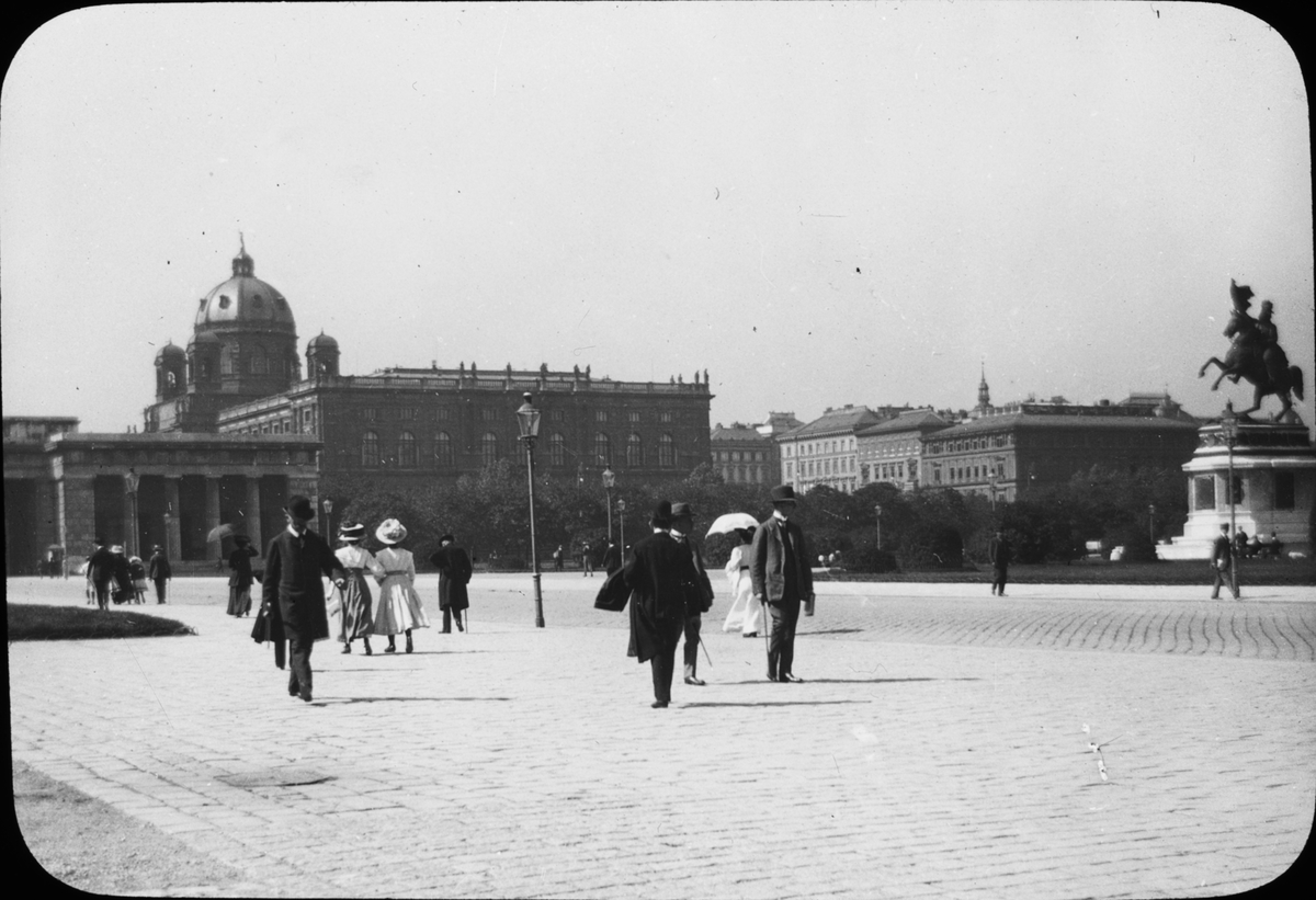 Bilden har förvarats i kartong märkt: Höstresan 1909. Wien 3. Salzburg 6. No 9. Text på bild: "Auserer Burg Platz.Erzh. Kart.".