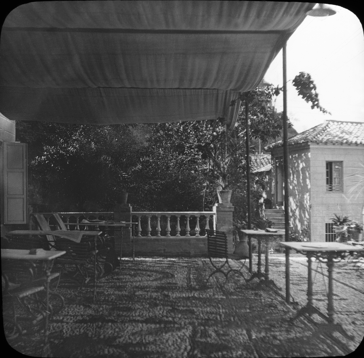 Skioptikonbild med motiv av terraassen på Hotel Bosque.