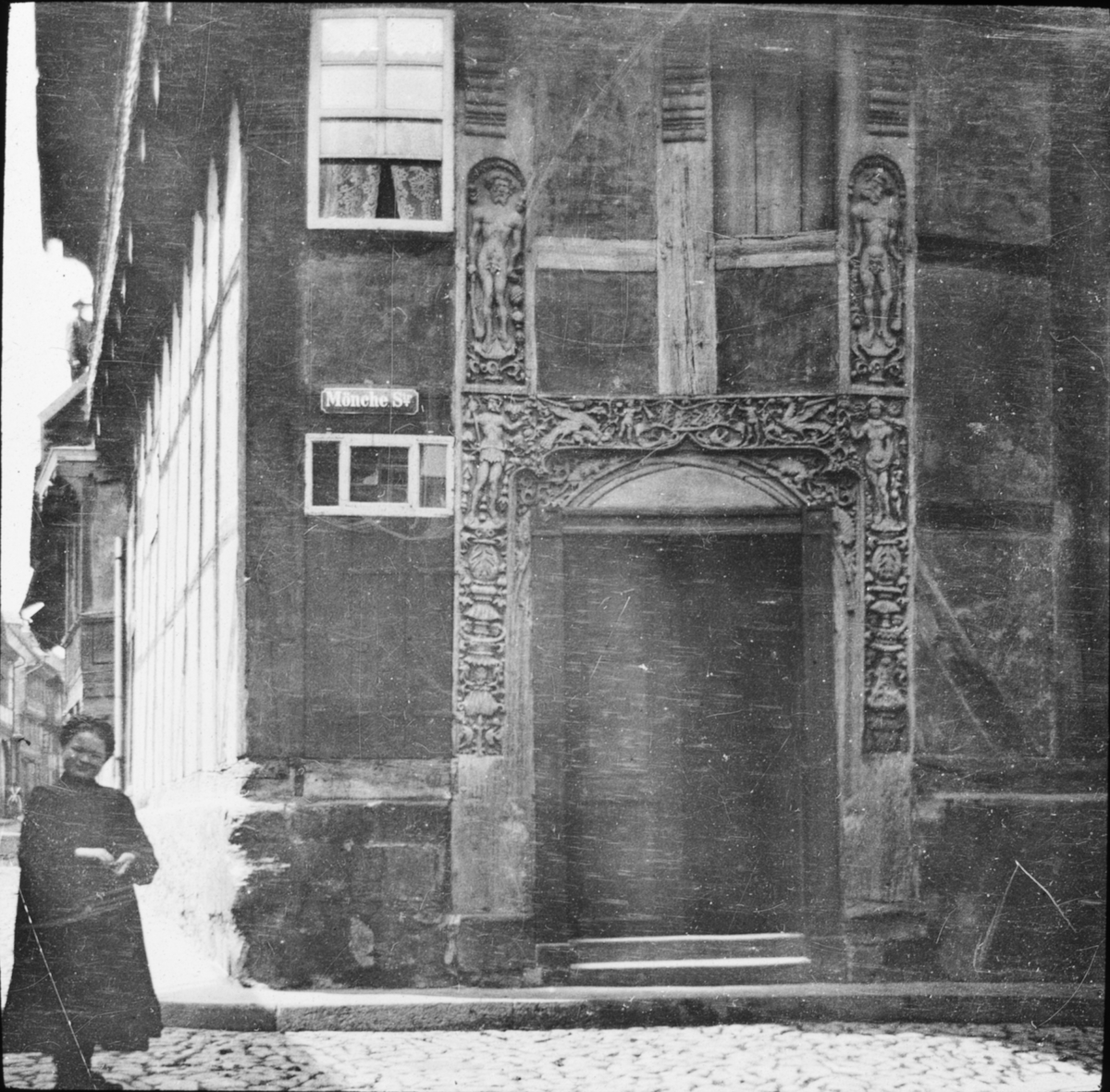 Skioptikonbild med motiv av kvinna vid port på Mönche Strasse i Goslar.