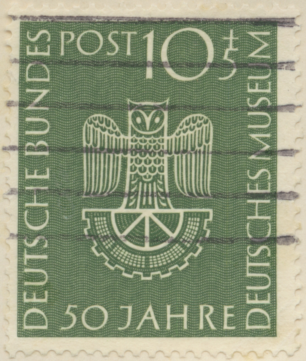 Frimärke från Tyskland, 1953. Motiv av Symbol: Uggla. Deutsches Museum 50 år München 1903-1953.