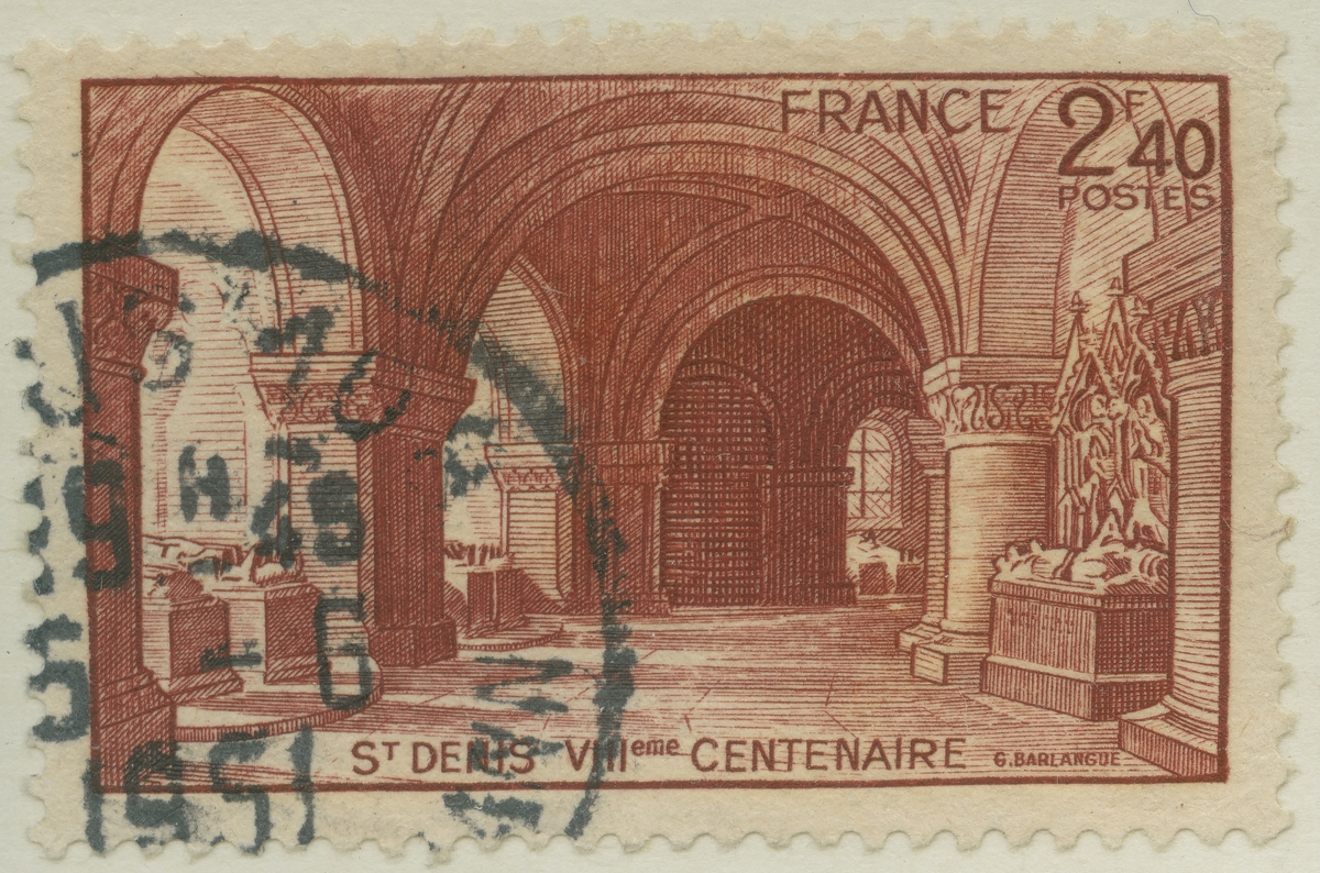 Frimärke från Frankrike, 1944. Motiv av Basilikan St. Denis i Paris, med franska kungagravar i kryptan. "800-årsminne av kyrkans grundläggning 1144-1944".