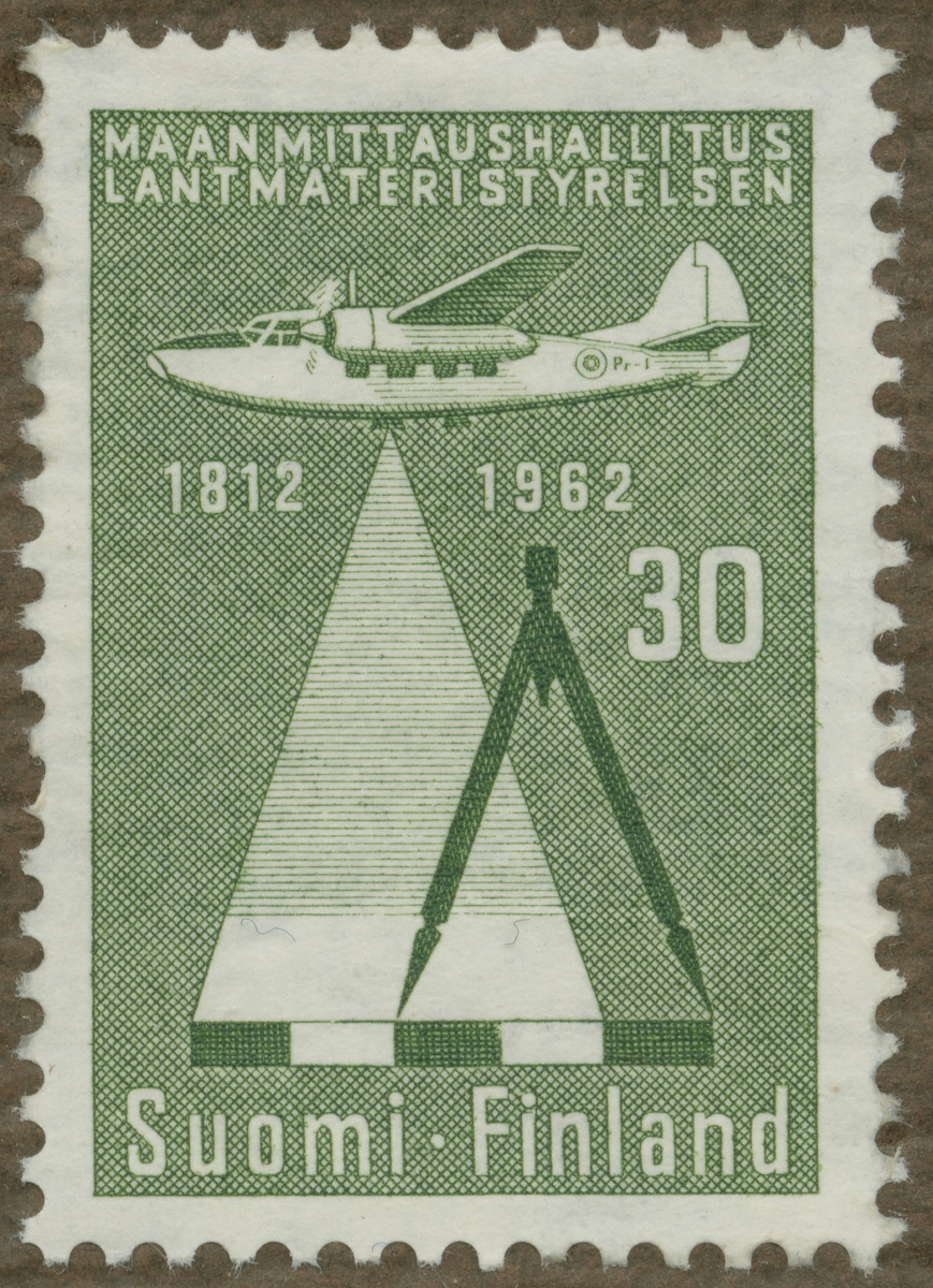 Frimärke från Finland, 1962. Motiv av symboler för lantmäteri. "Finska Lantmäteristyrelsen 150-år 1812-1962".