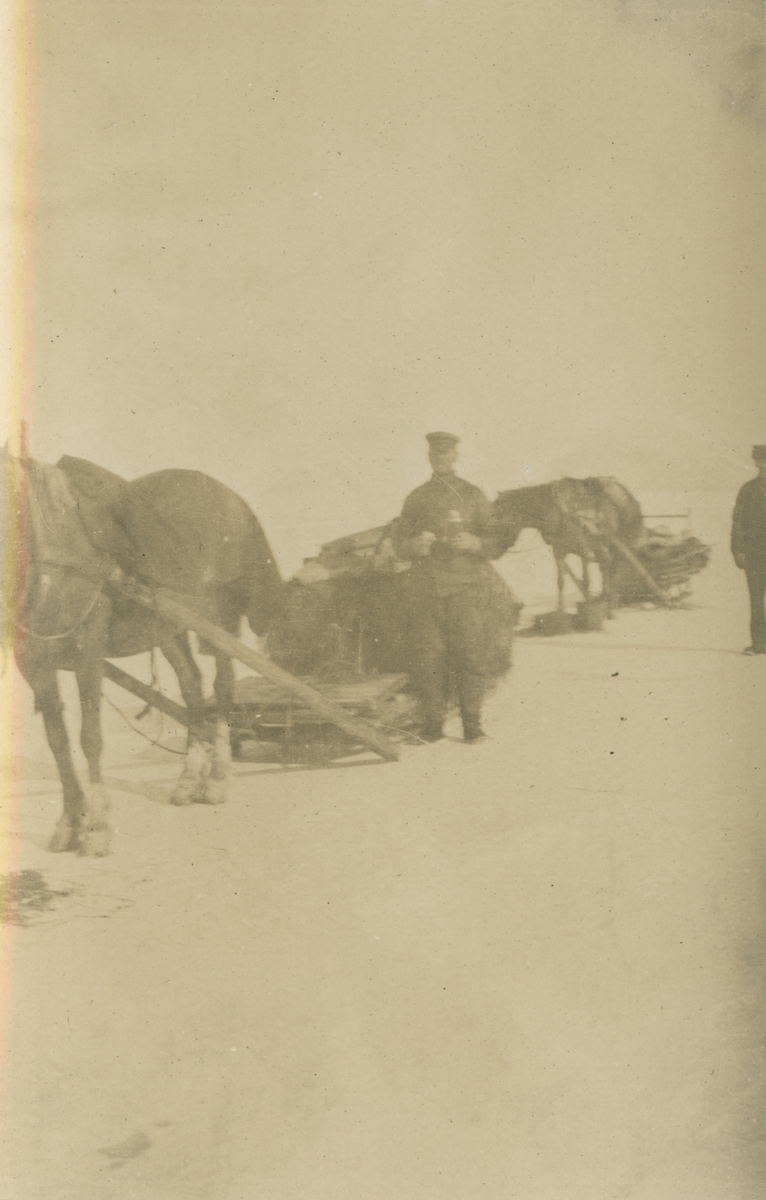 Fotografi från expedition till Spetsbergen. Motiv av man som står bredvid två hästar som drar fullpackade slädar genom snölandskap.