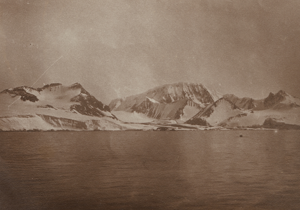 Fotografi från första svenska Antarktisexpeditionen 1901-1904. Vy över hav och snötäckta berg.