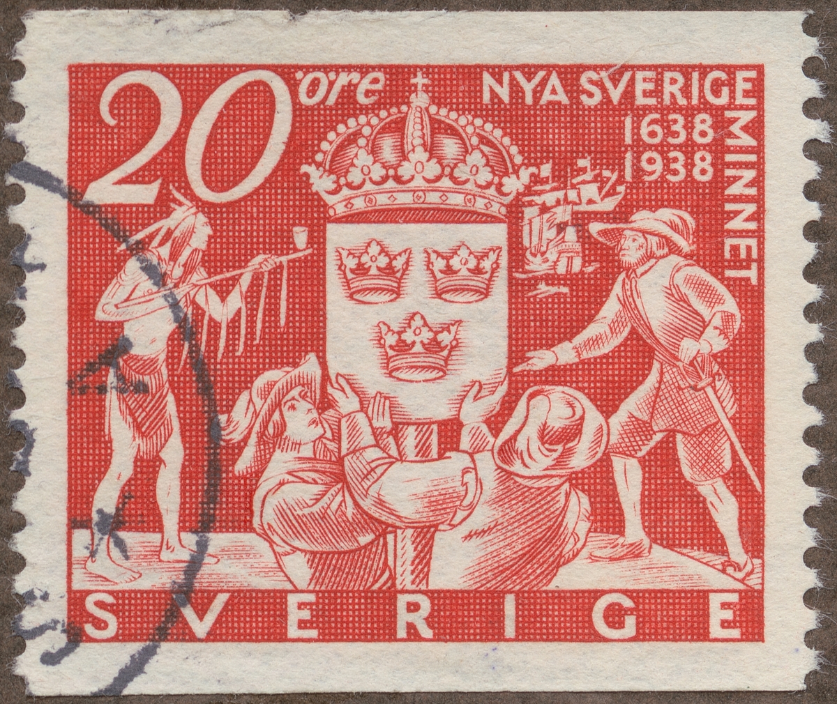 Frimärke från Sverige, 1938. Motiv av Svenskar möta ursprungsbefolkning i Delaware Nya Sverige-minnet 1638-1938