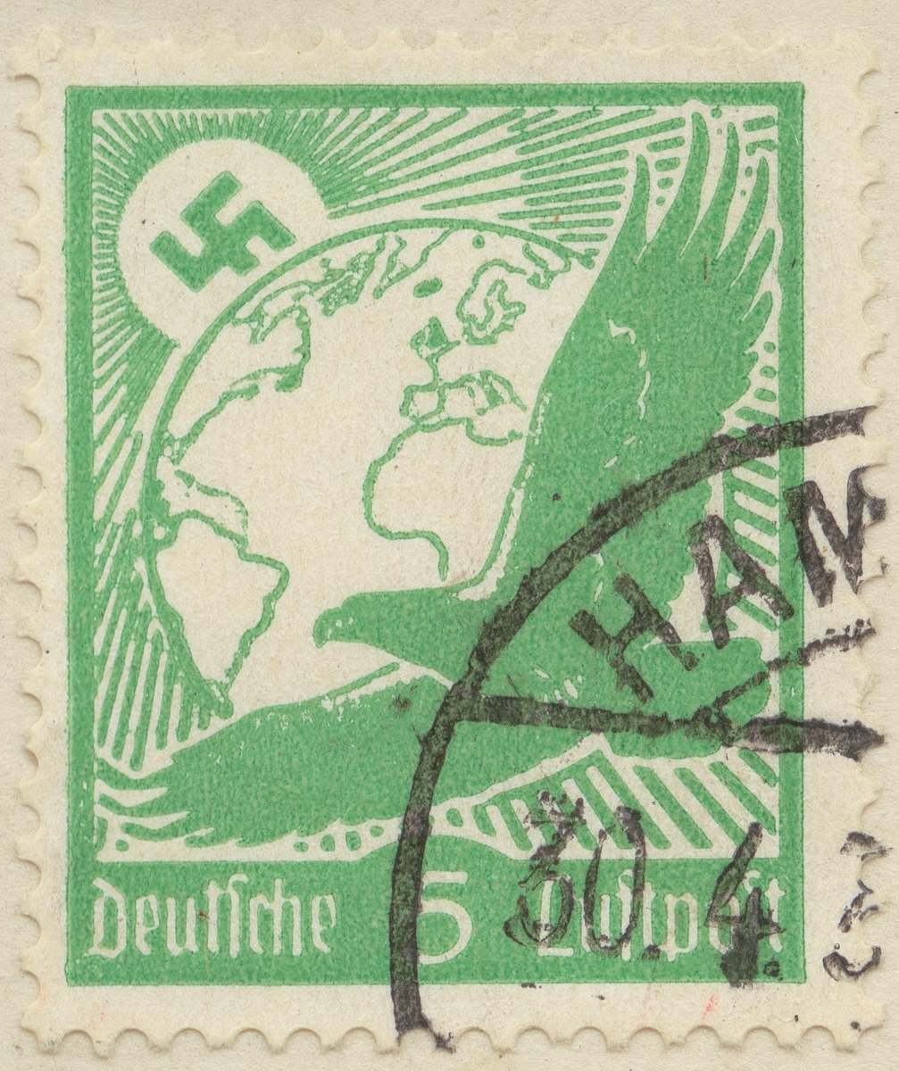 Frimärke från Tyskland, 1934. Motiv av Tyska Örnen och Hakkorset: Jordglob: "-Symbol för tysk luftpost samt världsmakt-"