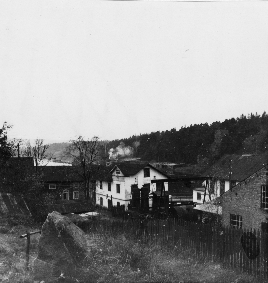Gustafsfors Fabrikers Aktiebolag. Sulfatfabrik. I bakgrunden Lelången och "posthuset" till vänster, kvarnen i mitten och byggnad för massaupptagningsmaskinen (gamla torkmaskinsalen) till höger. Längst till höger skymtar verkstadsbyggnaden.