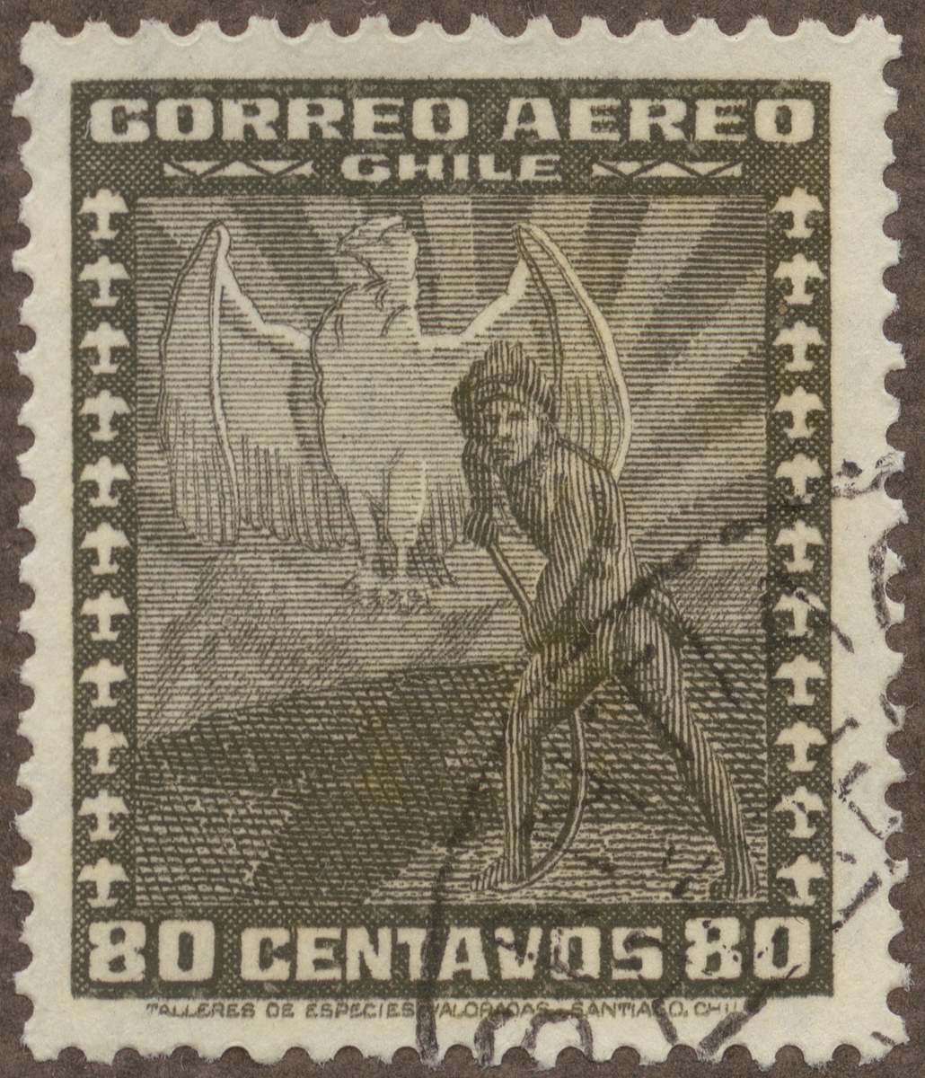 Frimärke från Chile, 1935. Motiv av Staty över Caupolican - Flygsymbol -