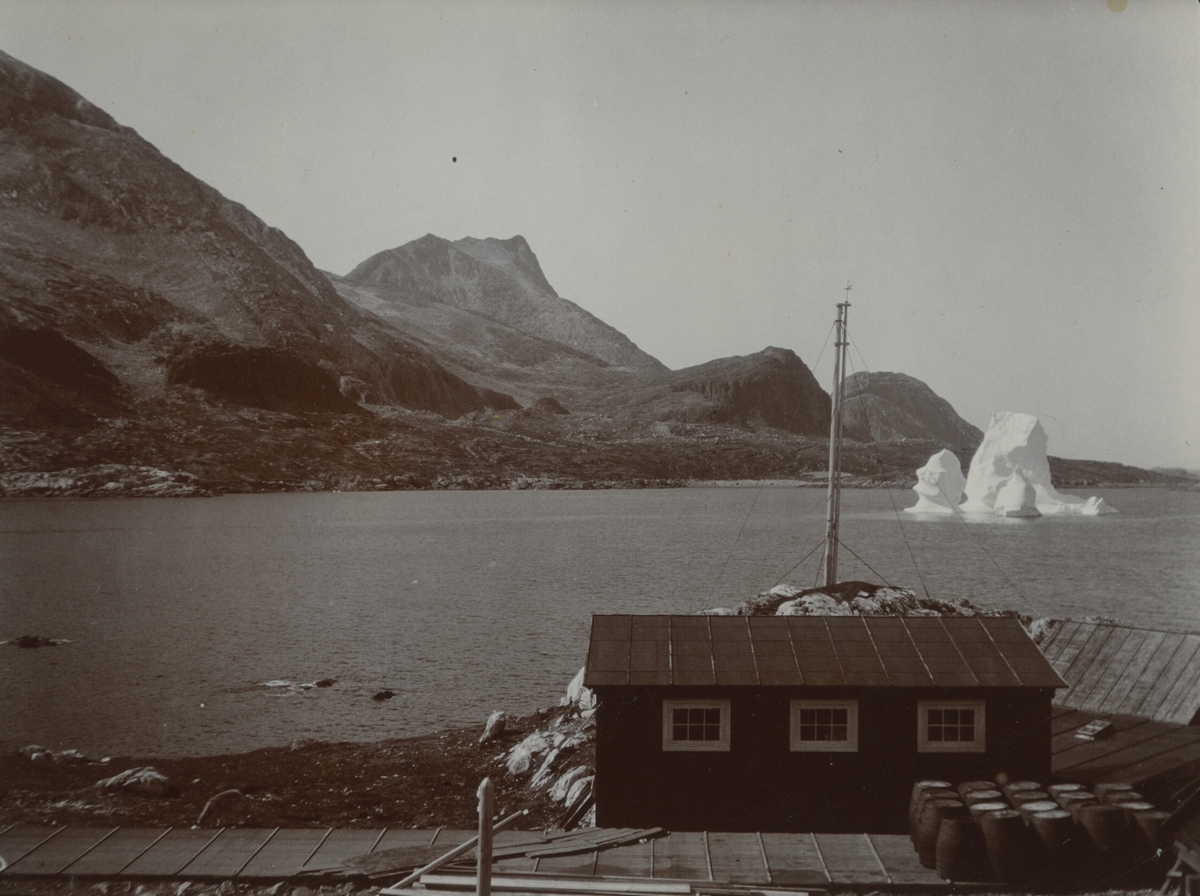 Fotografi från expedition till Grönland. Motiv av hus vid havet med isberg och berg i bakgrunden.