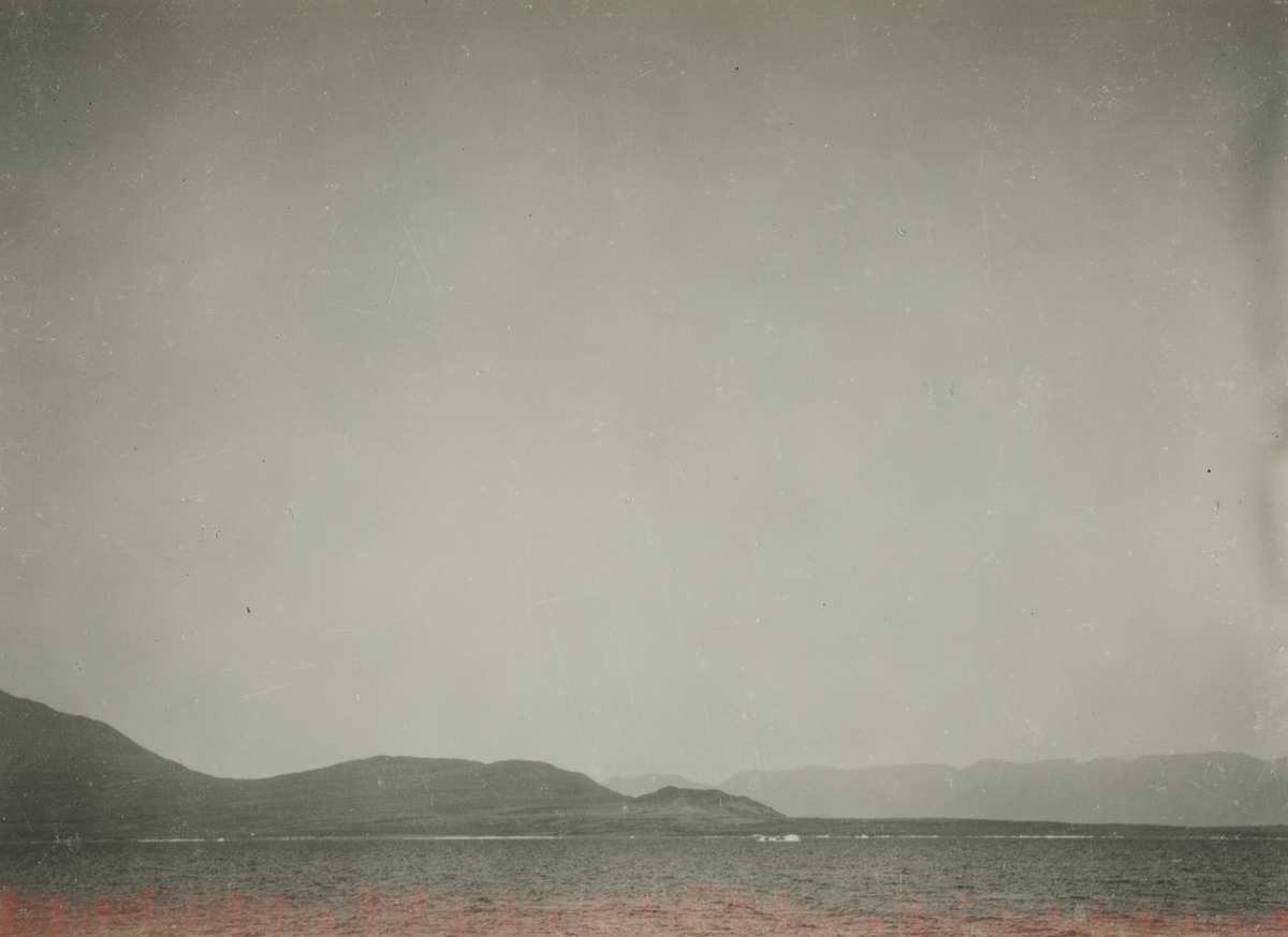 Titel: Fotografi från expedition till Östgrönland 1929. Dansk-svensk expedition under ledning av Lauge Koch. Svenska deltagare: Oscar Kulling och Helge Backlund. Vy över hav, berg och himmel.