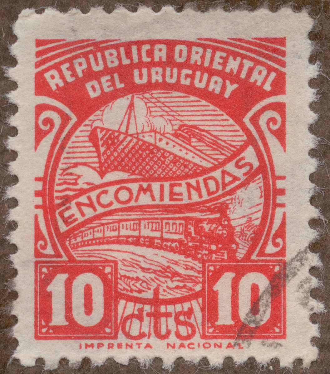 Frimärke från Uruguay, 1938. Motiv av Stor ångare Järnvägståg Paketpost