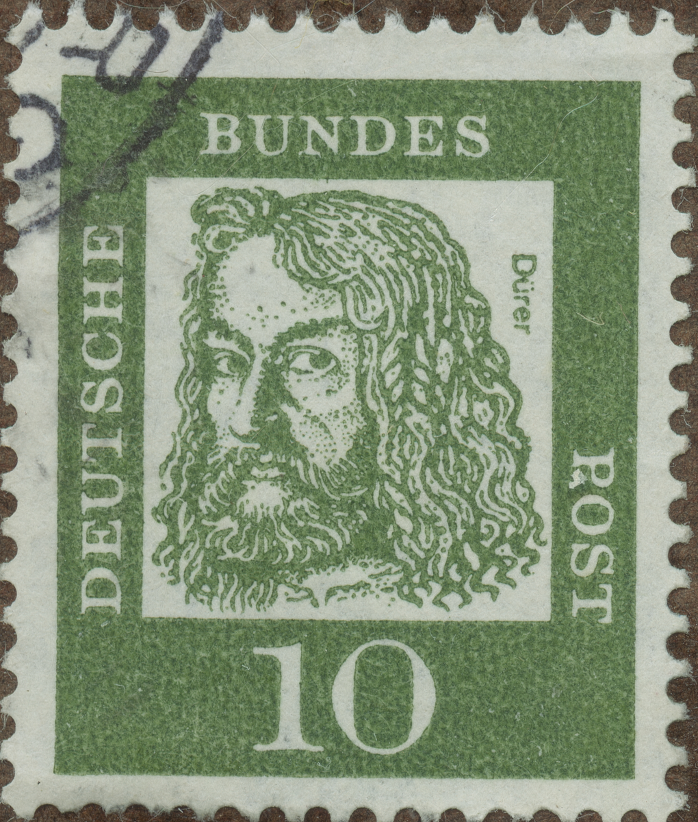 Frimärke från Västtyskland, 1961. Motiv av Albrecht Dürer 1471-1528 "Den tyska renässanskonstens förgrundsman. Främst träsnitt och kopparstick".